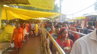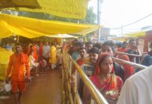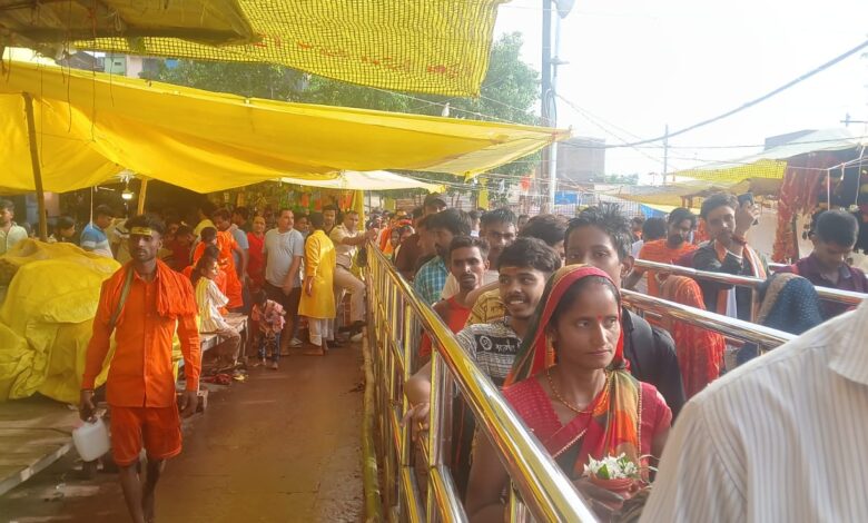 मंझवारी गांव से कंधे पर 54 फीट लंबी कांवर लेकर ब्रह्मपुर पहुंचे श्रद्धालु