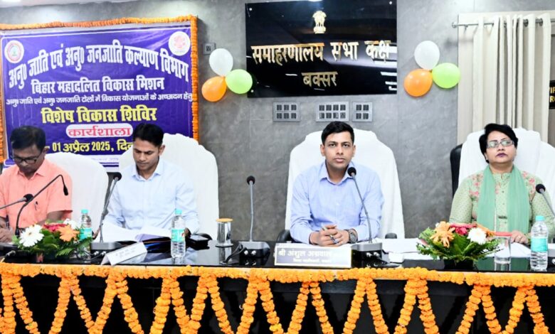 ताजा समाचार बक्सर जिले से हैं जहां जिलांतर्गत सभी अनुसूचित जाति एवं अनुसूचित जनजाति टोलों में विशेष विकास शिविर एवं सभी ग्राम संगठन स्तर पर महिला संवाद के सफल आयोजन हेतु आज दिनांक 01 अप्रैल 2025 को जिला पदाधिकारी बक्सर, श्री अंशुल अग्रवाल की अध्यक्षता में समाहरणालय सभा कक्ष में जिलास्तरीय कार्यशाला का आयोजन किया गया। जिला पदाधिकारी, अपर समाहर्ता, अनुमंडल पदाधिकारी, जिला कल्याण पदाधिकारी, जिला परियोजना प्रबंधक जीविका एवं अन्य के द्वारा संयुक्त रूप से दीप प्रज्वलित कर कार्यशाला का शुभारंभ किया गया। सभी अनुसूचित जाति एवं अनुसूचित जनजाति टोलों में विकास योजनाओं के आच्छादन हेतु विशेष विकास शिविर का आयोजन किया जाना है। इस शिविर में सरकार के प्रमुख विभागों की सहभागिता एवं उनसे जुडे़ योजनाओं का लाभ अनुसूचित जाति एवं अनुसूचित जनजाति परिवारों को दिलाया जाना लक्षित है।