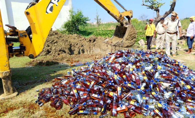 एसपी व डीएम के मौजूदगी में लगभग 13500 लीटर शराब को जे सी बी से किया गया विनष्ट