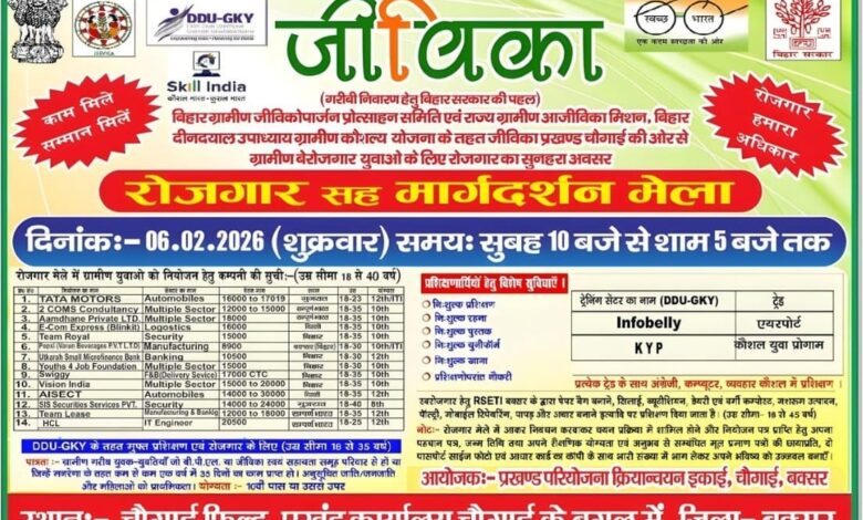 जिले के युवाओं के लिए रोजगार पाने का सुनहरा अवसर 06 फरवरी 2026 को प्रखंड कार्यालय चौगाई के समीप आयोजित रोजगार सह मार्गदर्शन मेला में मिलने जा रहा है। जीविका के माध्यम से दीन दयाल उपाध्याय ग्रामीण कौशल्य योजना (DDU-GKY) अंतर्गत आयोजित इस मेले का शुभारंभ जिला पदाधिकारी बक्सर द्वारा किया जाएगा।