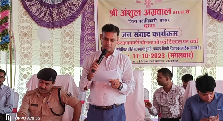 बक्सर जिले के सिमरी प्रखंड अंतर्गत डी० के० मेमोरियल कॉलेज डुमरी के खेल मैदान में मंगलवार को जन संवाद कार्यक्रम का आयोजन किया गया । जिसका उद्घाटन अनुमंडल पदाधिकारी कुमार पंकज डीएसपी अफाक अख्तर अंसारी ने दीप प्रज्वलित कर किया तथा संचालन राष्ट्रीय एंकर रवि रंजन राय ने की । इस दौरान जन संवाद कार्यक्रम में विभिन्न विभाग के जिले से उपस्थित पदाधिकारीयों को डुमरी पंचायत के मुखिया प्रेम सागर कुमार जिला पार्षद कमलबास कुंवर उप प्रमुख चंदन कुमार सरपंच धर्मपाल कुमार सहित अन्य प्रतिनिधियों द्वारा फूल माला अंग वस्त्र और गुलदस्ता देकर सम्मानित किया । वहीं हजारों की संख्या में उपस्थित ग्रामीण महिला पुरुषों के बीच अधिकारियों ने अधिकारियों ने बारी-बारी से उनकी समस्याओं को सुना और उनके समस्याओं के निष्पादन हेतु आश्वासन दिया । मौके पर मौजूद प्रखंड विकास पदाधिकारी शशिकांत शर्मा के द्वारा विभिन्न योजनाओं से संबंधित बने अलग-अलग काउंटरों पर । वृद्धा पेंशन इंदिरा आवास राशन कार्ड नल जल वृक्षारोपण शौचालय निर्माण सहित अन्य कुल 150 आवेदन जमा करवाया गया । प्रखंड विकास पदाधिकारी ने बताया कि डुमरी पंचायत के लगभग 44 लोगों को विभिन्न योजनाओं से लाभान्वित किया गया है इस बीच कार्यक्रम को लेकर जिला प्रशासन के निर्देश पर सिमरी थानाध्यक्ष अमन कुमार अपर थाना अध्यक्ष सुमन कुमार सिंह व अन्य पुलिस बल के जवान कार्यक्रम स्थल पर तैनात रहे । कार्यक्रम में जिले के विभिन्न विभाग के अधिकारियों और सिमरी प्रखंड के सिमरी पंचायत से मुखिया प्रतिनिधि प्रमोद कुमार पांडे सहित पंचायत से मुखिया प्रतिनिधि मनोज कुमार उपाध्याय इकौना पंचायत के मुखिया अशोक राय राजापुर पंचायत के मुखिया मदन राय गांगुली पंचायत के मुखिया अशोक धोबी सहित अन्य जनप्रतिनिधि और समाज सेवियों के साथ हजारों की संख्या में ग्रामीण महिला पुरुष मौजूद रहें।