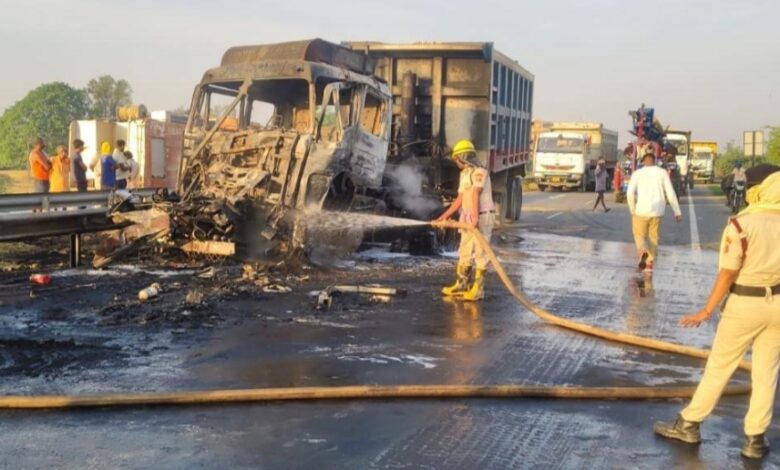 डंपर-ट्रक में जोरदार टक्कर के बाद लगी भीषण आग