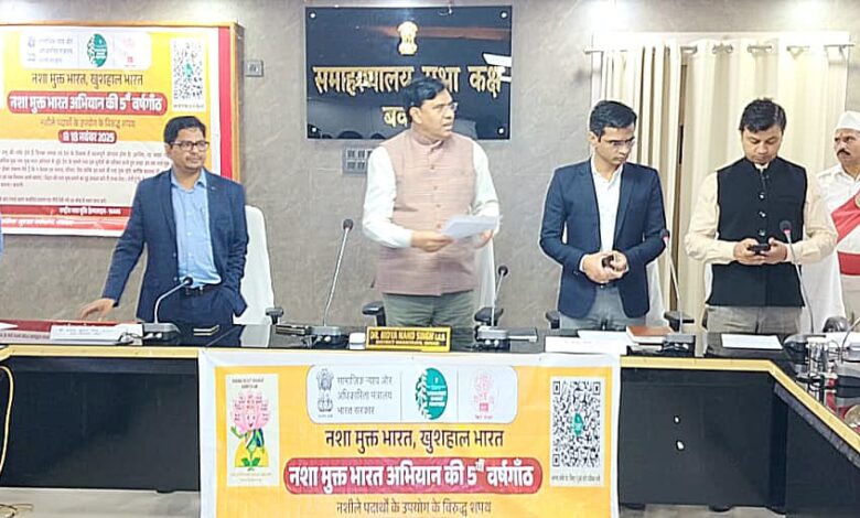 समाहरणालय परिसर स्थित सभाकक्ष में आज जिला सामाजिक सुरक्षा कोषांग के तत्वावधान में नशा मुक्त भारत अभियान की 5वीं वर्षगांठ पर नशीले पदार्थों के विरुद्ध शपथ ग्रहण कार्यक्रम आयोजित किया गया। कार्यक्रम की अध्यक्षता जिला पदाधिकारी डॉ. विद्यानंद सिंह ने की।