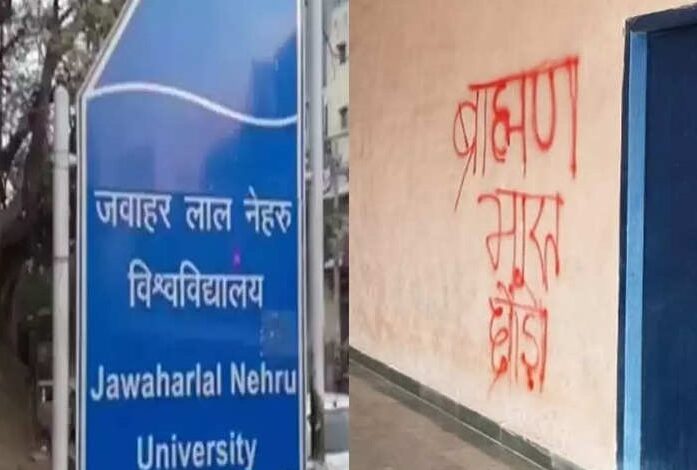 जवाहर लाल नेहरू विश्वविद्यालय (जेएनयू) के स्कूल ऑफ इंटरनेशनल स्टडीज जातिसूचक (SIS) में जातिसूचक टिप्पणी लिखने पर हंगामा मचा हुआ है। विश्वविद्यालय की कुलपति प्रो. शांतिश्री धुलिपुड़ी ने इस मामले की जांच का आदेश दे दिया है। इस बीच, फैकल्टी रूम और दीवारों पर ब्राह्मणविरोधी नारे लिखे जाने पर सोशल मीडिया पर संग्राम मचा हुआ है। एक फैकल्टी रूम के गेट पर भी गो बैक शाखा लिखा हुआ है। इधर, इस घटना के बाद सियासी बयानबाजी भी शुरू हो गए हैं। हरियाणा के मंत्री अनिल विज ने कहा है कि ब्रह्मण विरोधी नारे की निंदा करता हूं। उन्होंने कहा कि ऐसी सोच को कुचल देना चाहिए। इस बीच, अखिल भारतीय विद्यार्थी परिषद (एबीवीपी) ने लेफ्ट विंग पर ये स्लोगन लिखने का आरोप लगाया है।